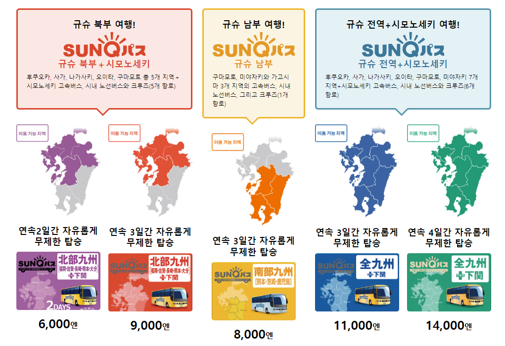 - 북큐슈 산큐패스: 후쿠오카, 사가, 나가사키, 구마모토, 오이타 규슈 북부 지역의 버스와 고속버스,크루즈를 이용할 수 있습니다.