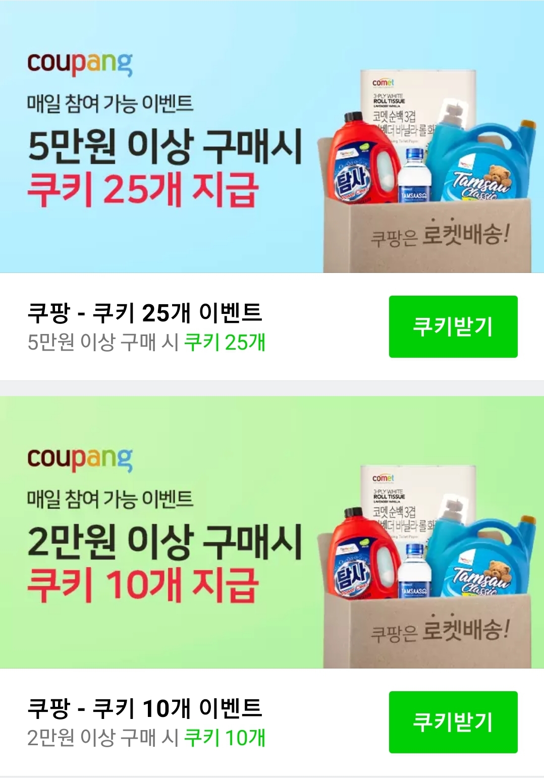 아래 보이는 것처럼 2만원 이상 사면 쿠키 10개, 5만원 이상 사면 쿠키 25개를 준다. 쿠팡 앱에서 미리 장바구니 담아두고 저 링크를 따라 넘어가서 바로 구매하면 된다.