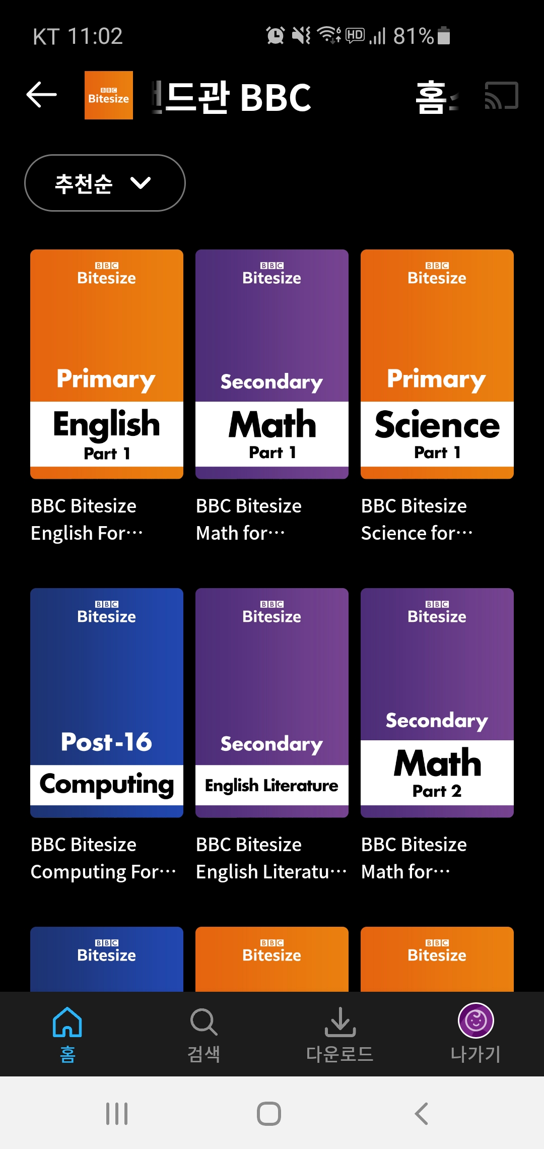 영어, 수학, 과학, 컴퓨팅 과목들이 보이고, 각 과목별 파트가 나눠있는데 레벨별인지는 모르겠네요.