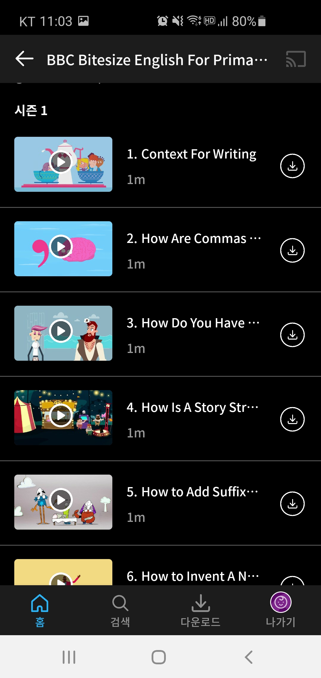 잉글리시 파트1에 들어가 봤어요. 1분짜리 영상들이 시리즈물처럼 올라와있네요.