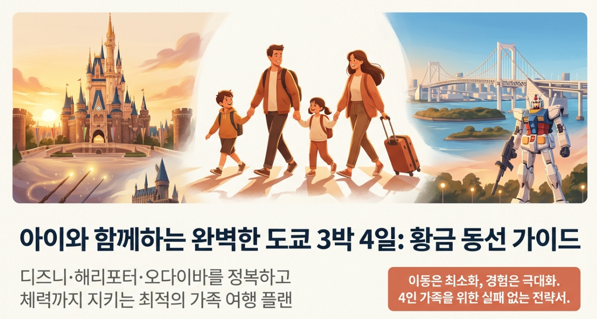 하지만 걱정 마세요. 수많은 시행착오 끝에 찾아낸, 서울 출발 4인 가족을 위한 3박 4일 '필승' 코스를 지금부터 공개합니다. 도쿄의 핵심인 디즈니랜드, 해리포터 스튜디오, 오다이바를 모두 정복하면서도 이동과 체력 소모는 최소화하는 최적의 동선! 이 글 하나로 여러분의 복잡한 여행 계획을 완벽하게 끝내드릴게요.