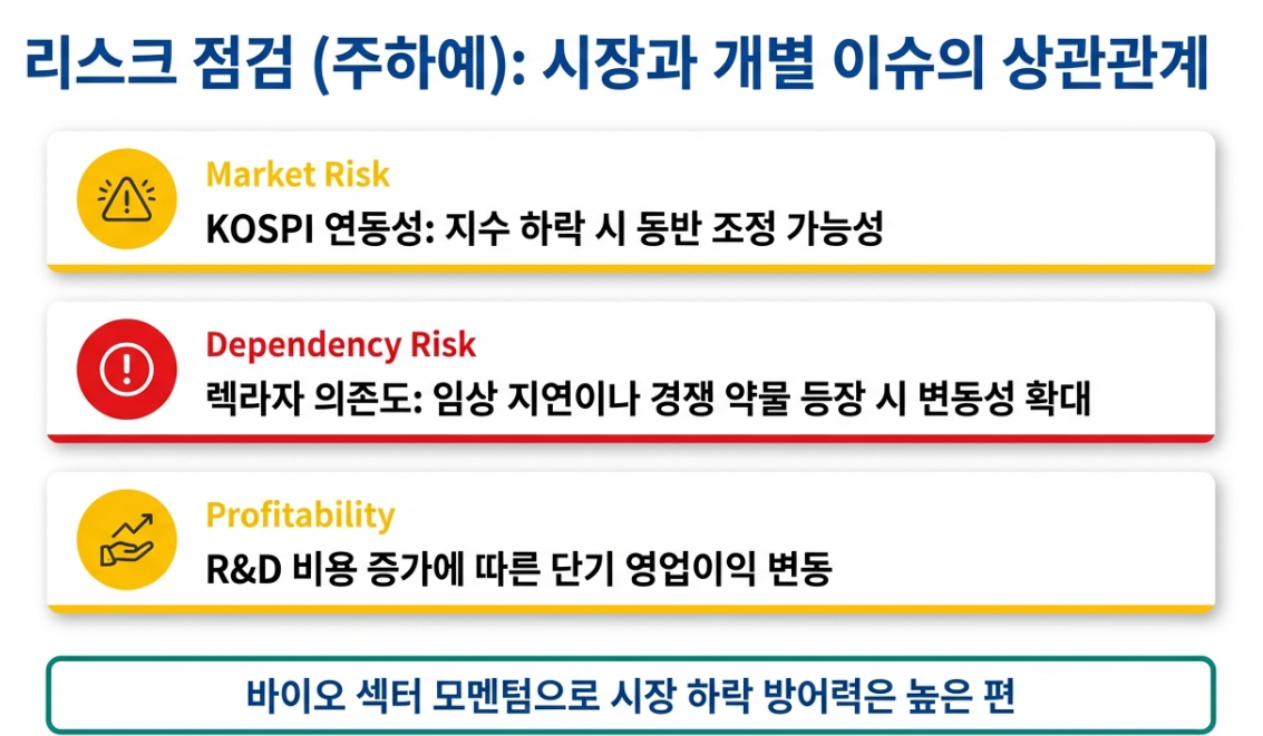 - R&D 불확실성: 공격적인 R&D 투자는 필수적이나, 후속 파이프라인의 임상 지연이나 실패 시 시장의 신뢰도 하락과 함께 단기 수익성 지표가 악화될 위험이 상존합니다.