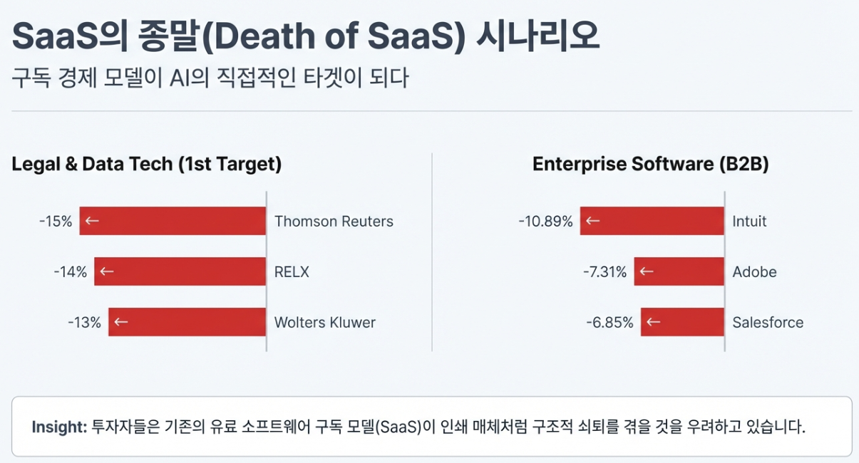 "AI가 발전함에 따라 혼란에 빠질 수 있는 소프트웨어 종목들이 하락 리스트의 최상단을 차지하고 있습니다. 이는 단순한 하락이 아니라, 기존 소프트웨어 생태계의 수익 모델에 대한 근본적인 의구심입니다." — 아트 호건(Art Hogan), B. 라일리 웰스 수석 시장전략가
