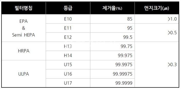 두번째로 봐야 할 것은 필터의 종류와 등급이다. 위에 예를 든 두모델 중 미에어2S는 E10, 미에어는 H13의 필터 등급을 보여준다. 필터 등급표는 다음과 같다.