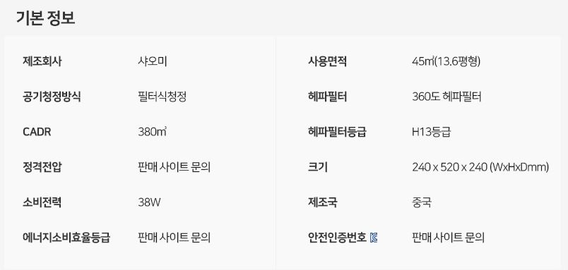 같은 크기의 제품인 미에어2S와 미에어3H도 사용면적이 차이가 나는 것을 볼 수 있다. 사용면적과 연관이 있는 스펙은 출력(소비전력)으로 미에어2S의 29W , 미에어3H의 38W로 출력의 차이만큼 사용면적이 넓어지는 것이 일반적이다. 출력이 크다는 것은 그만큼 풍량이 세서 공기를 원활하게 순환시킬 수 있지만 소음도 커질 수 있다는 것을 의미하기 때문에 자세한 제품 설명이나 후기를 보고 결정하길 바란다.