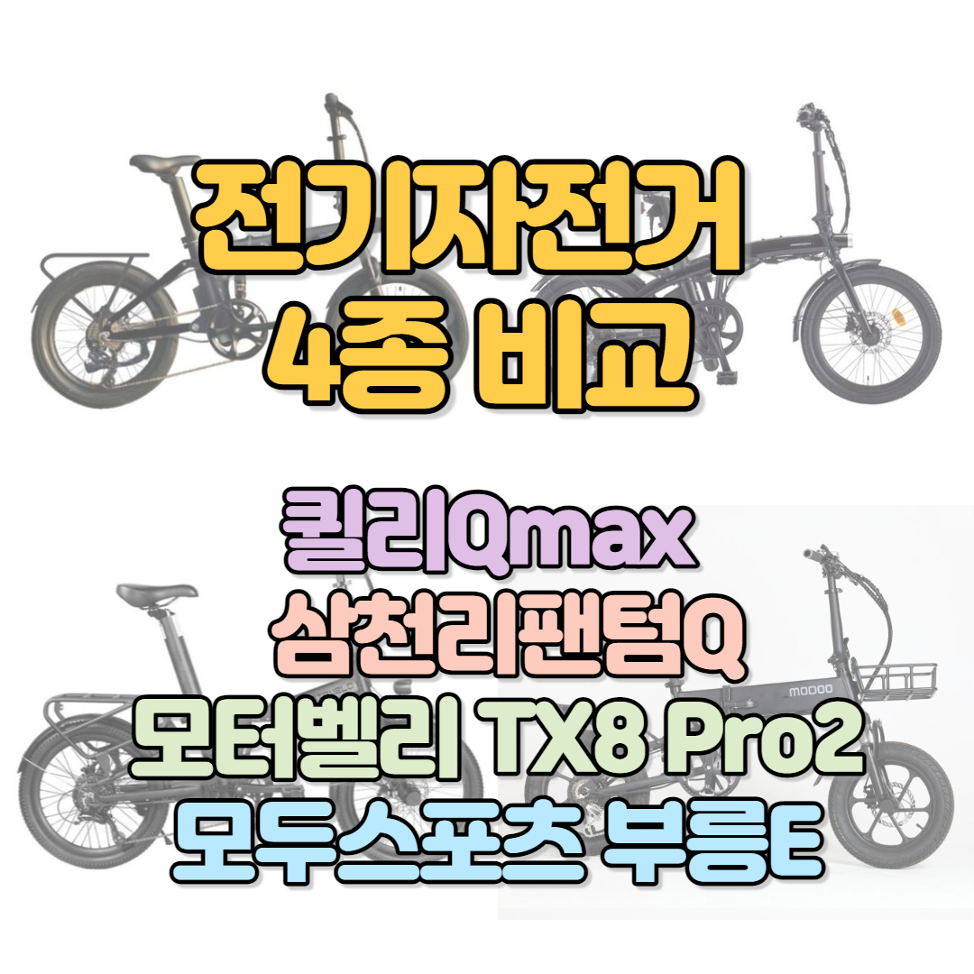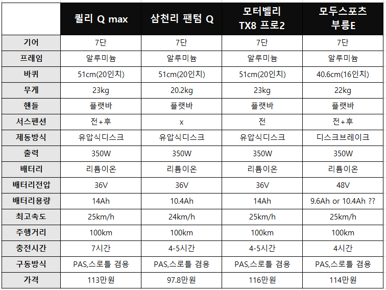 전기자전거 4종 SPEC 비교 / 퀼리Qmax & 삼천리팬텀Q & 모터벨리 TX8 pro2 & 모두스포츠 부릉E 고급형