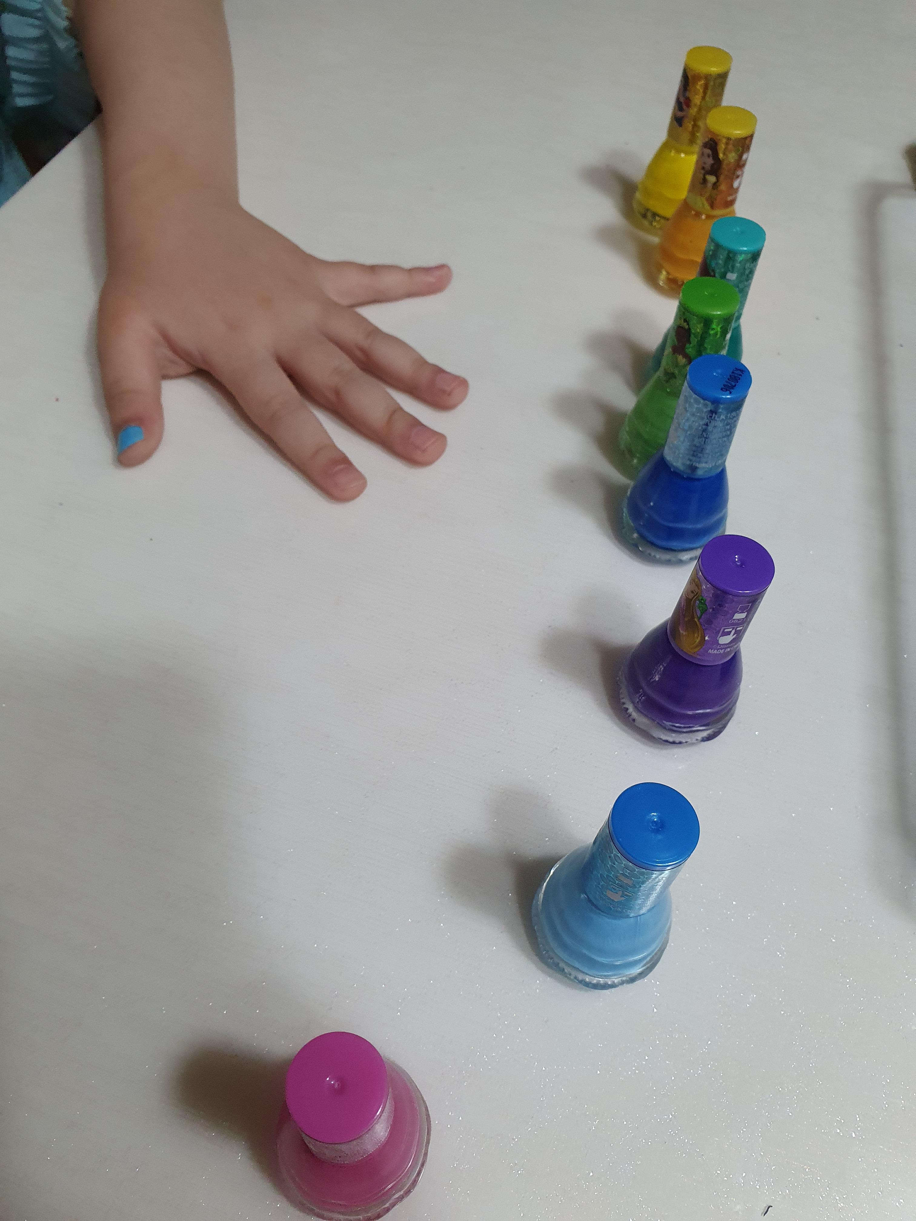 우리 아이들은 한가지 색 고민하지 않고 색색가지로 발라요. ㅎㅎ 자기들이 알아서 바를때도 있지만, 아무래도 엄마가 발라주는게 더 예쁘니 엄마에게 손을 내밀고 발라달라고도 하지요~ 네일아트 시간이 된답니다.