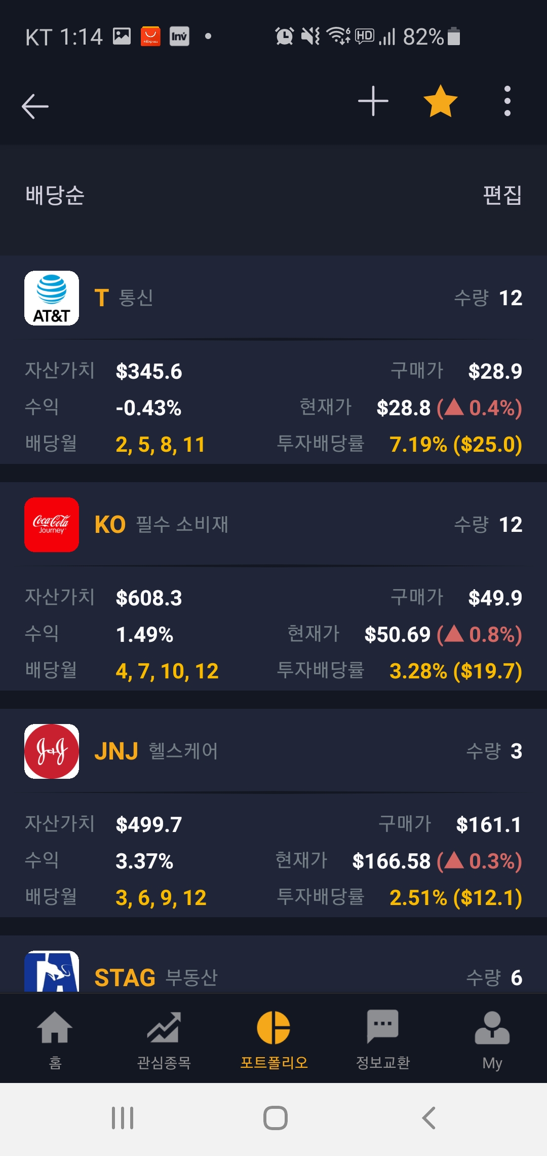 종목별로도 이름은 티커로 보이지만, 옆에 로고도 나와있어서 어렵지 않게 종목 구분도 되고, 각 종목별로 주식수량, 자산가치, 현재가, 배당월, 투자 배당률 등이 나와서 너무 보기 편하답니다.