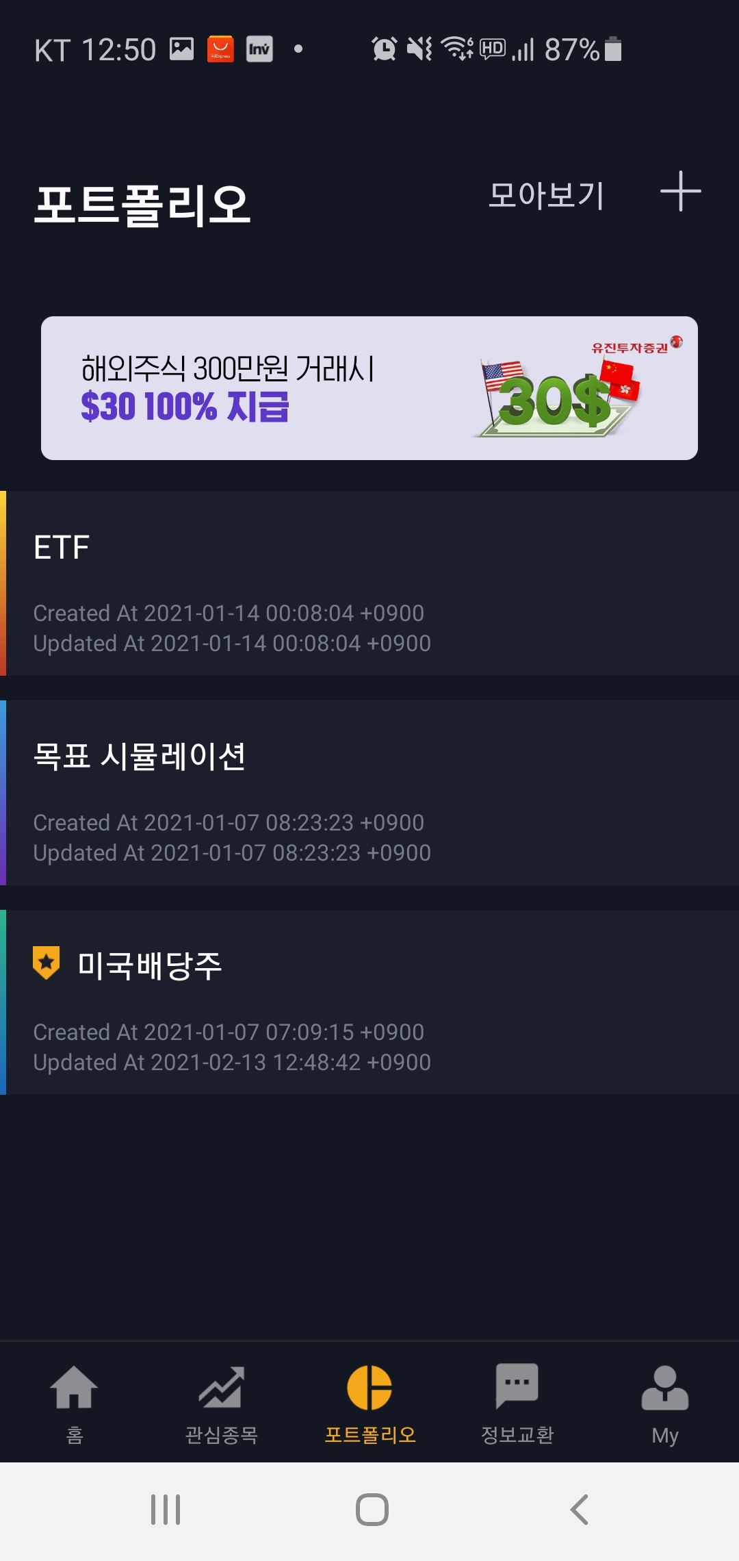 간단 가입을 하고 들어가 보면 포트폴리오 메뉴를 주로 이용하게 되는데요. 저는 실제 매매한 주식들뿐 아니라, 시뮬레이션 해보기 위한 포트폴리오도 추가해봤어요.