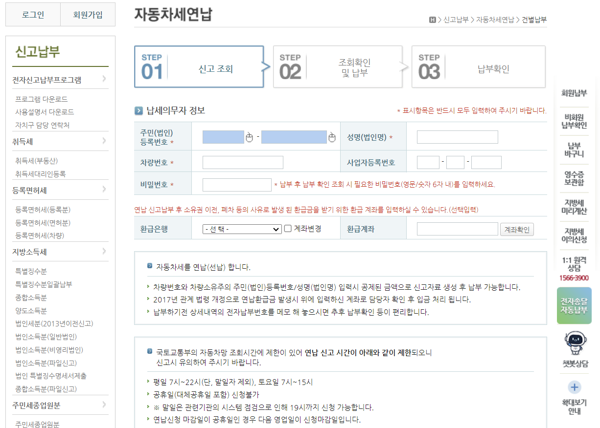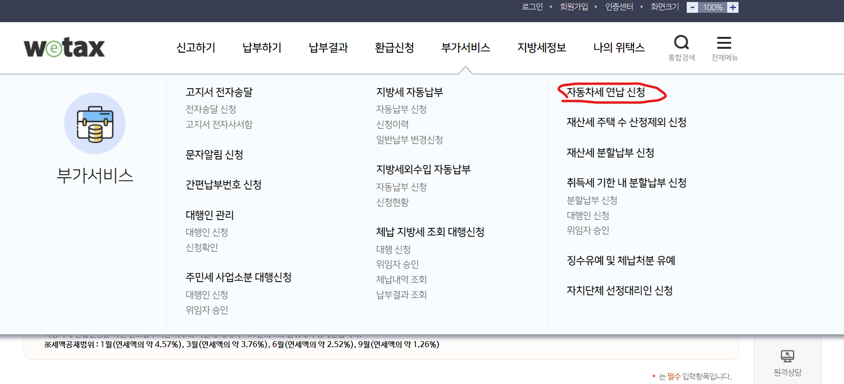 로그인 후 부가서비스 -> 자동차세 연납신청