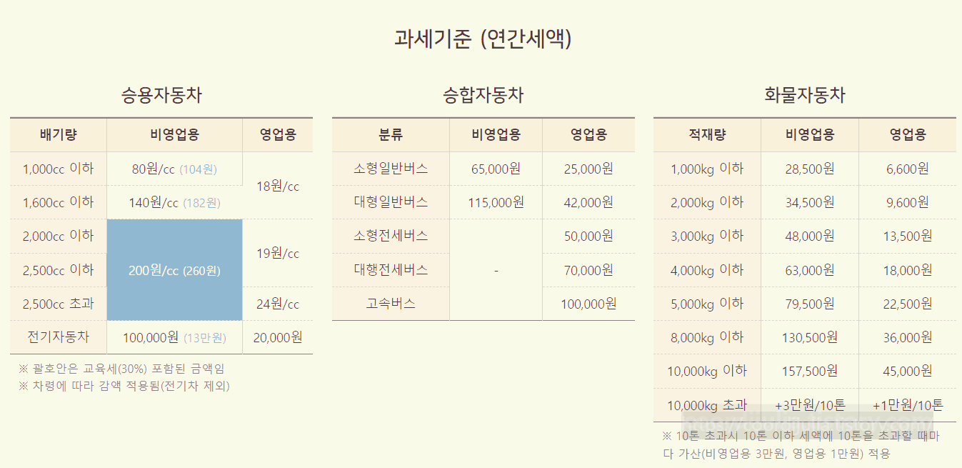 예> 2019년식 그랜져 3.0 : 3000cc X 260 (2500cc 초과, 교육세포함) = 780,000 원(연간세액)