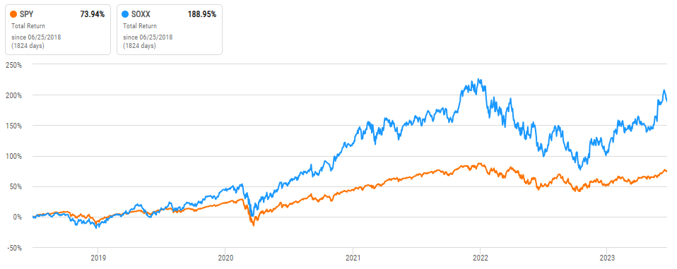 1. 반도체 산업 포괄성: SOXX는 PHLX Semiconductor Sector Index를 추적하므로 반도체 산업 전반에 걸친 포트폴리오를 제공합니다. 이는 투자자들이 개별 기업이 아닌 전반적인 섹터의 성과에 노출되게 함으로써 산업의 변동성에 대비할 수 있는 장점으로 이어집니다.