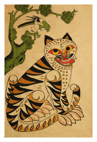 - 민화 속 호랑이는 종종 우스꽝스럽고 어리숙한 모습으로 그려집니다. 이는 단순한 맹수가 아니라, 권력자나 양반 계층을 풍자하는 상징으로 해석되기도 합니다.