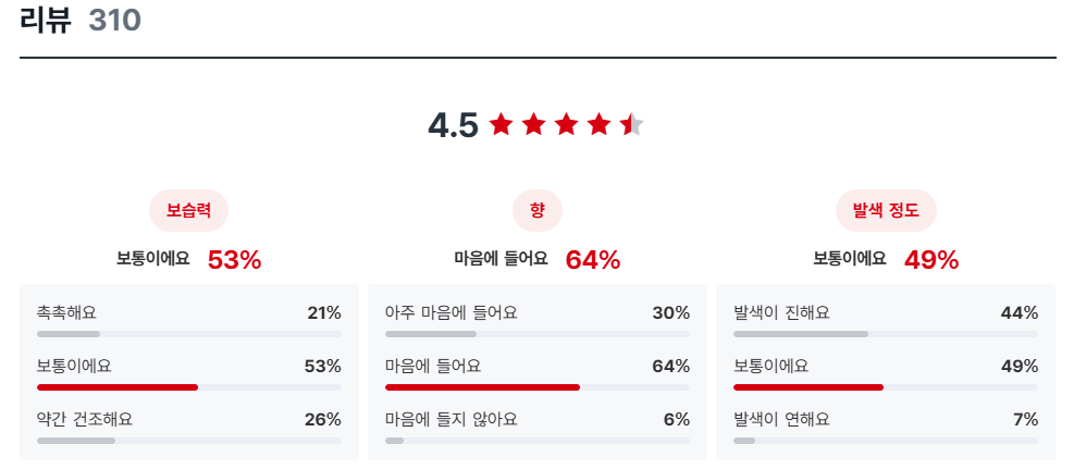 - 지속력: 물티슈로 문질러도 80% 이상 유지, 식사 후에도 컬러 유지됨