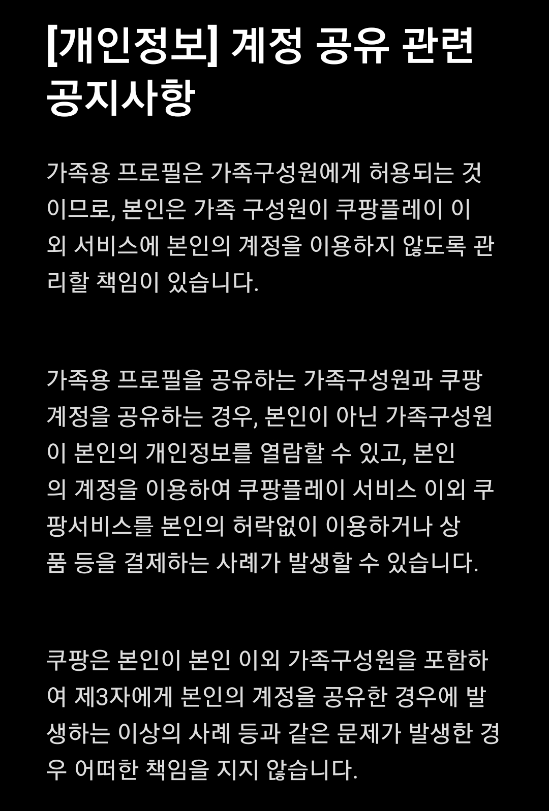 쿠팡어플을 한번 로그인 해줘야 하기 때문에 쿠팡 플레이에 계정 공유 관련하여 아래와 같은 FAQ 답변이 공지사항으로 올라와 있다.