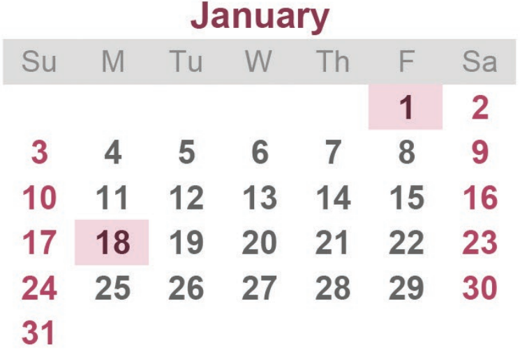 1월1일, 1월18일, 2월15일, 4월2일, 5월31일, 7월5일, 9월6일, 11월25일, 12월24일이다.