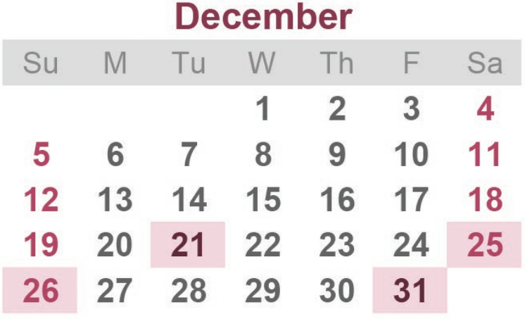 특이사항은 7월5일, 12월24일로 각각 7월4일, 12월25일이 일요일이기 때문에 대체휴일로 되어 쉬게된다.