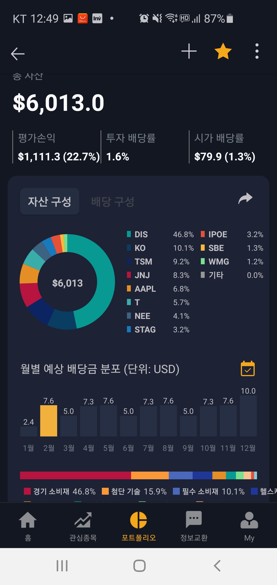 저는 작년 중반쯤 매수한 후 배당컷당한 디즈니 주식이 거의 반을 차지하고 있어서 투자 배당률은 좋지는 않지만, 디즈니를 제외하고 본다면 꽤 좋은 배당률을 가지고 있답니다.